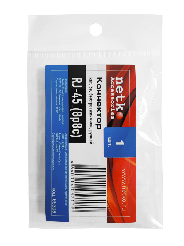 Коннектор RJ45 (8p8c) cat.5e, быстрозажимной ручной, для одножильного и многожильного UTP кабеля, NETKO Optima