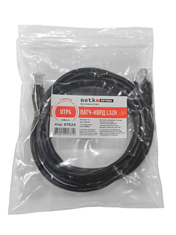 Патч-корд UTP4 cat 5e, 3,0м, ВС, LSZH, черный, литой коннектор NETKO Optima
