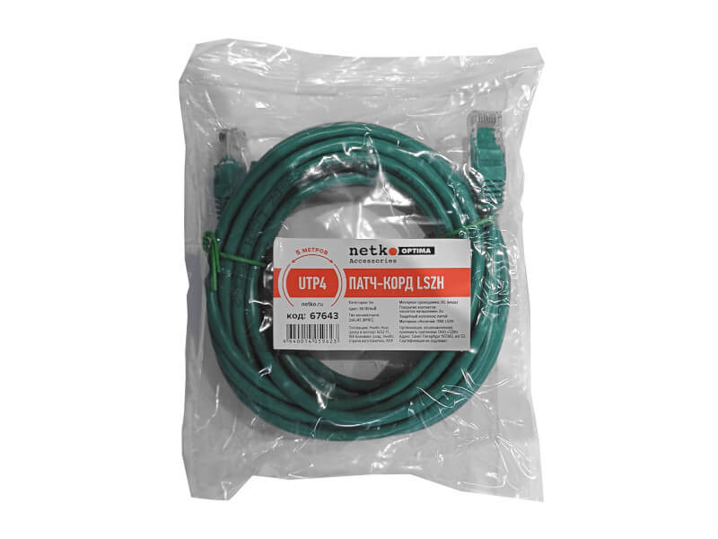 Патч-корд UTP4 cat 5e, 5,0м, ВС, LSZH, зеленый, литой коннектор NETKO Optima