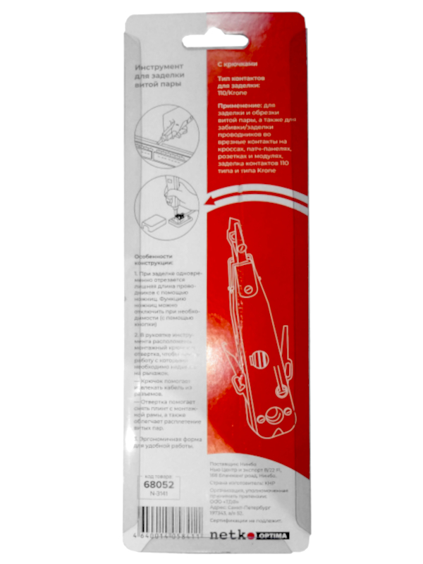 N-3141 Инструмент для заделки витой пары, тип 110/Krone, с крючками, NETKO Optima