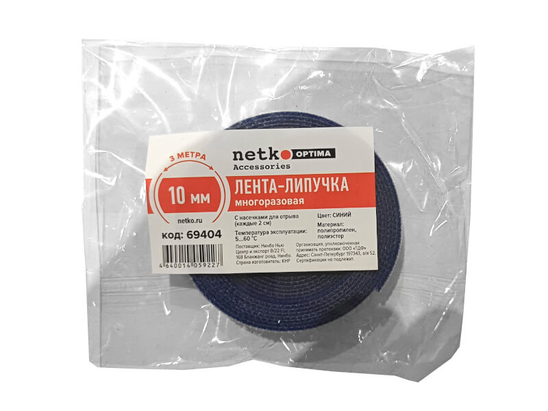 Лента-липучка многоразовая 10мм*3м, с насечками для отрыва (каждые 2 см), синяя NETKO Optima