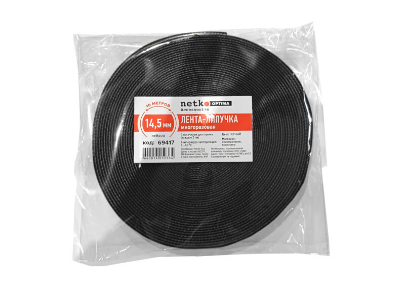 Лента-липучка многоразовая 14,5мм*10м, с насечками для отрыва (каждые 2 см), черная NETKO Optima