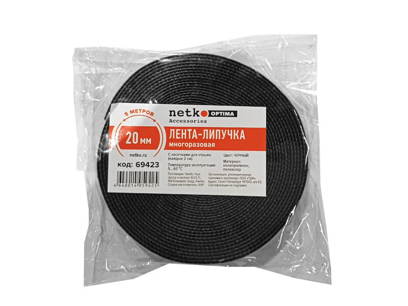 Лента-липучка многоразовая 20мм*5м, с насечками для отрыва (каждые 2 см), черная NETKO Optima