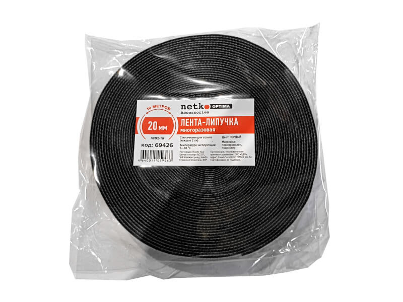 Лента-липучка многоразовая 20мм*10м, с насечками для отрыва (каждые 2 см), черная NETKO Optima