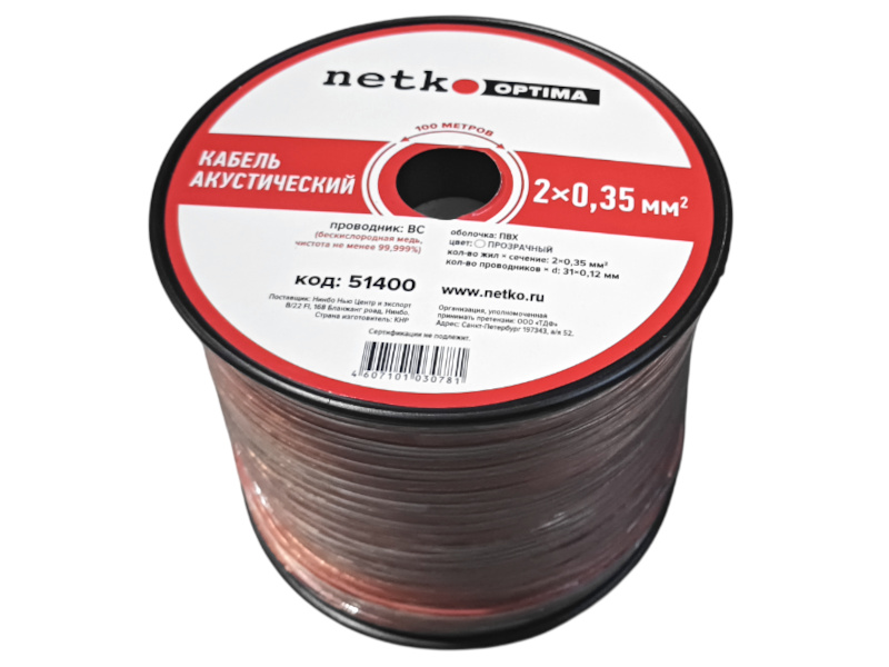 Кабель акустический 2*0.35мм2 (31*0.12мм) BC, 100м, пластиковая катушка, прозрачный NETKO Optima