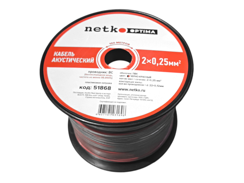 Кабель акустический 2*0.25мм2 (22*0.12мм) BC, 100м, пластиковая катушка, черный/красный NETKO Optima