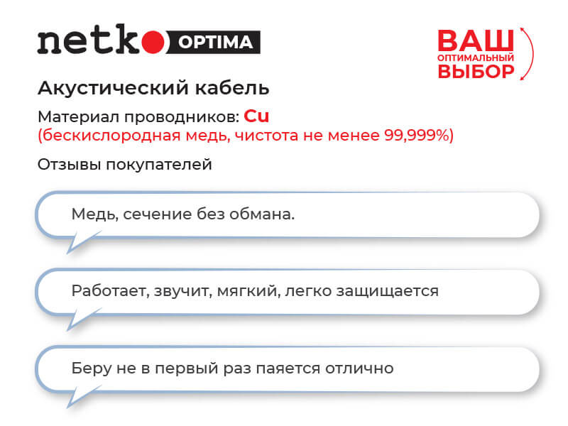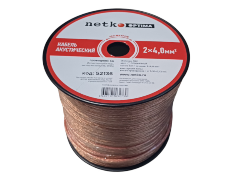 Кабель акустический 2*4.0мм2 (7*51*0.12мм) BC, 100м, пластиковая катушка, прозрачный NETKO Optima