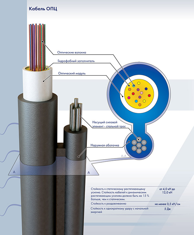 Кабель ВО подвесной с тросом (многомодульный) ОПЦ-16А-4 (стальной трос 4кН)