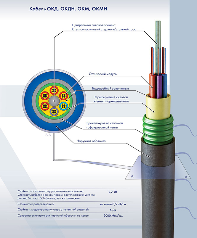 Кабель ВО для подземной прокладки в кабельную канализацию ОКД-8А-2,7 (2,7кН), бронированный