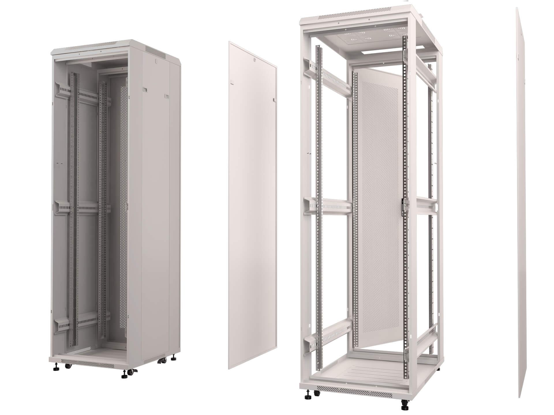 Очень часто наши клиенты просили иметь возможность самостоятельно выбрать тип двери, поэтому теперь в базовой комплектации шкаф поставляется без передней двери. Этот факт никак не увеличивает общую цену шкафа, просто вы сами выбираете ту дверь, которая вам нужна (стеклянная, металлическая, с перфорацией). Двери универсальные – вы можете устанавливать их как спереди, так и сзади.