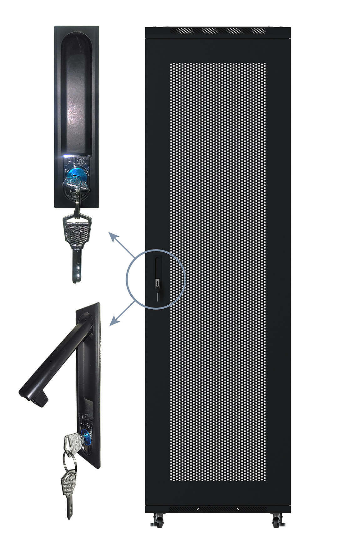В шкафах с высокой грузоподъёмностью размещают серьезное оборудование (сервера, ИБП), которые сильно нагреваются в процессе работы. При этом не всегда в шкафу остается достаточно места для установки необходимого количества вентиляторов. Для дополнительной вентиляции в базовую комплектацию включена задняя дверь с перфорацией, тк именно она становится все более и более востребованной среди наших клиентов. Дверь выполнена из закаленной стали, как и раньше, но толщина металла стала больше, а также оборудована надежным замком, поэтому можно не переживать за сохранность оборудования. По желанию вы также можете приобрести двойную металлическую дверь с перфорацией.