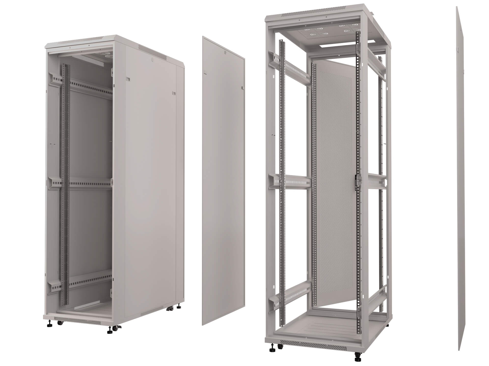Очень часто наши клиенты просили иметь возможность самостоятельно выбрать тип двери, поэтому теперь в базовой комплектации шкаф поставляется без передней двери. Этот факт никак не увеличивает общую цену шкафа, просто вы сами выбираете ту дверь, которая вам нужна (стеклянная, металлическая, с перфорацией). Двери универсальные – вы можете устанавливать их как спереди, так и сзади.