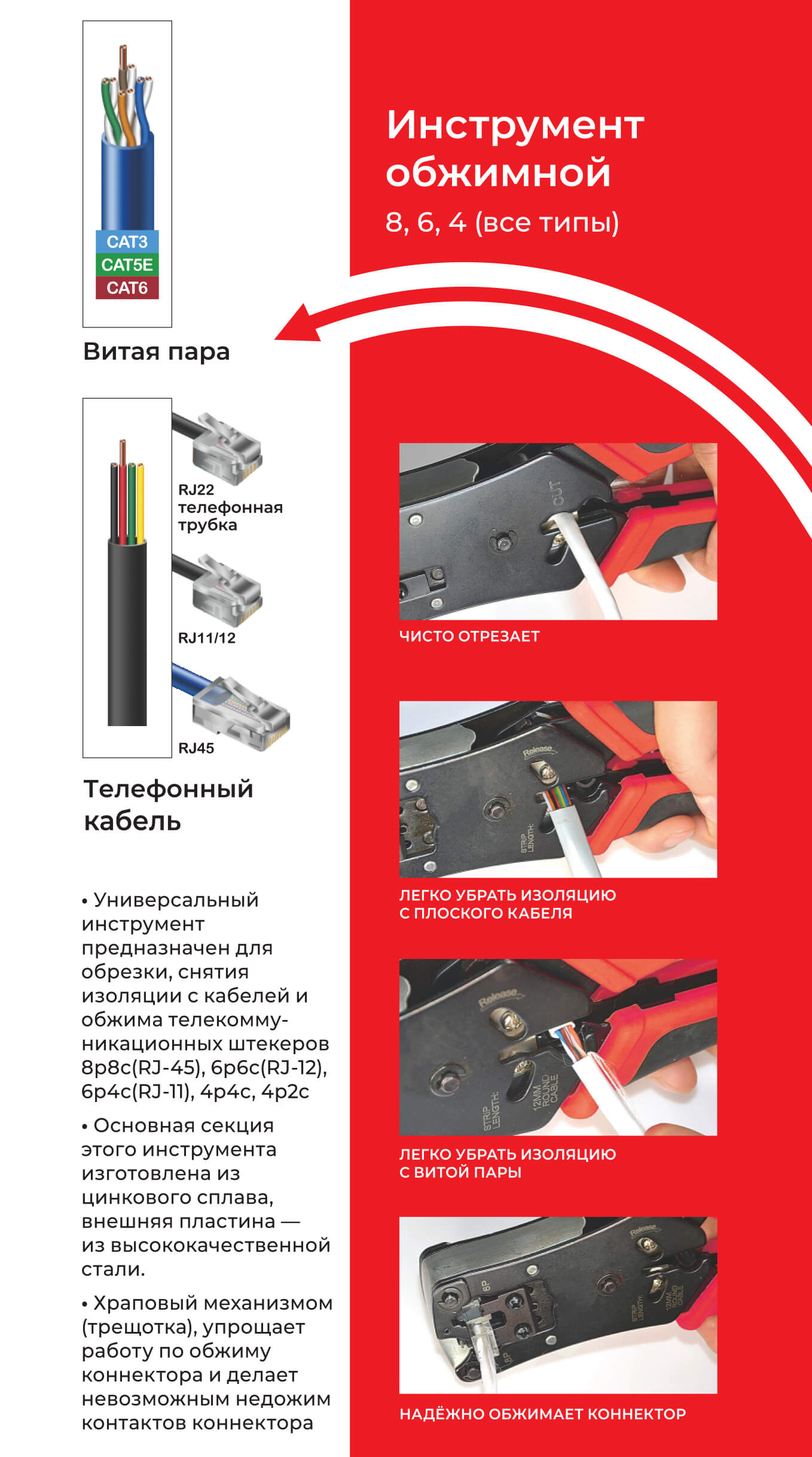 Универсальный инструмент с параллельным типом действия предназначен для обрезки, снятия изоляции с кабелей и обжима телекоммуникационных штекеров (типы штекеров см. ниже)
