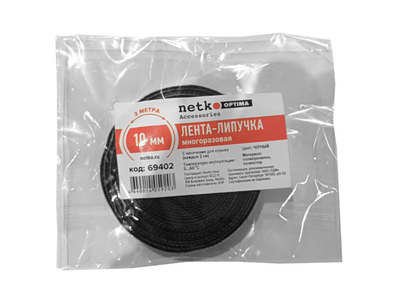 Лента-липучка многоразовая 10мм*3м, с насечками для отрыва (каждые 2 см), черная NETKO Optima
