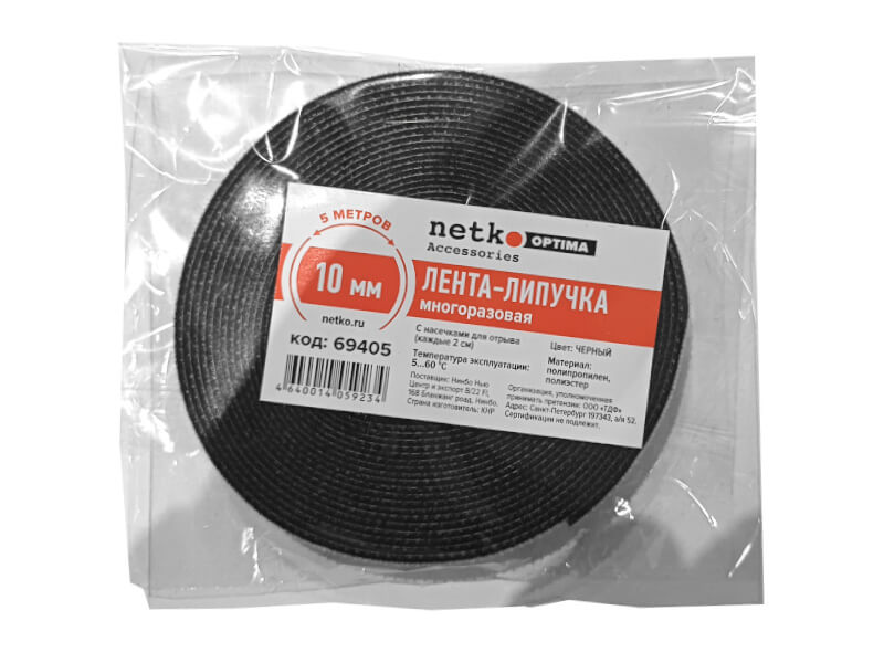 Лента-липучка многоразовая 10мм*5м, с насечками для отрыва (каждые 2 см), черная NETKO Optima