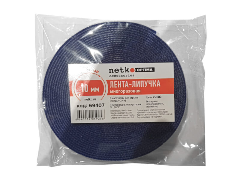 Лента-липучка многоразовая 10мм*5м, с насечками для отрыва (каждые 2 см), синяя NETKO Optima