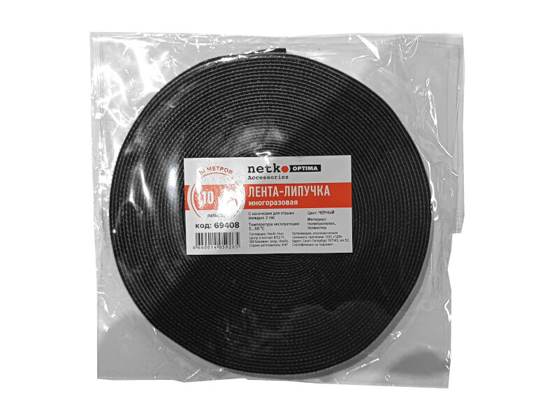 Лента-липучка многоразовая 10мм*10м, с насечками для отрыва (каждые 2 см), черная NETKO Optima