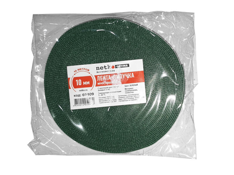 Лента-липучка многоразовая 10мм*10м, с насечками для отрыва (каждые 2 см), зеленая NETKO Optima