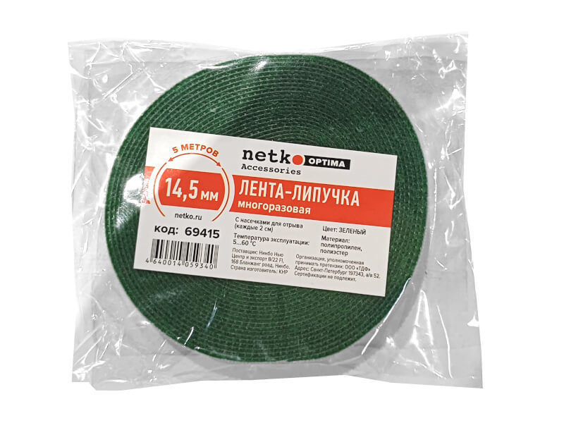 Лента-липучка многоразовая 14,5мм*5м, с насечками для отрыва (каждые 2 см), зеленая NETKO Optima