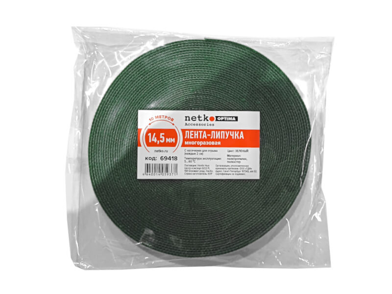 Лента-липучка многоразовая 14,5мм*10м, с насечками для отрыва (каждые 2 см), зеленая NETKO Optima