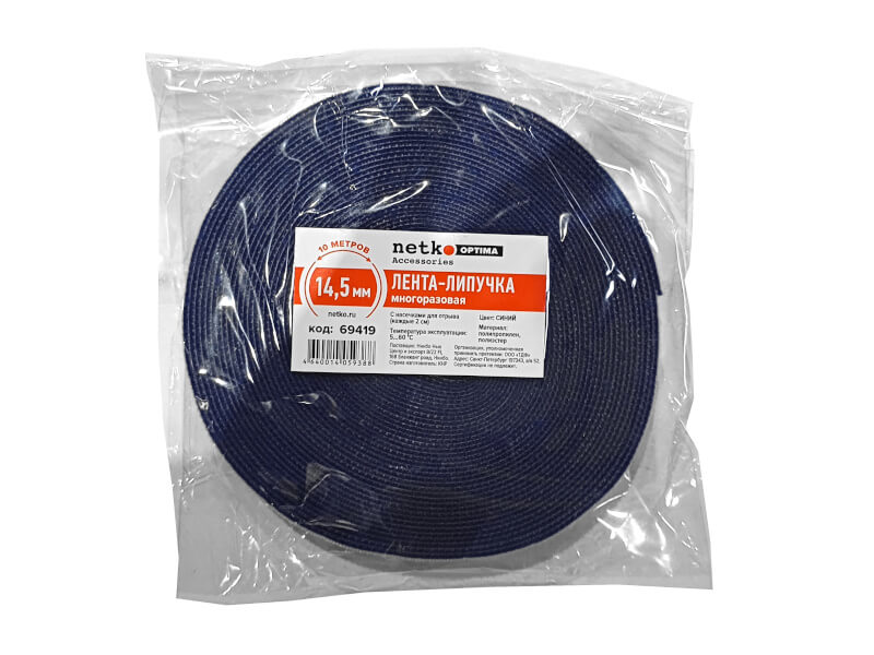 Лента-липучка многоразовая 14,5мм*10м, с насечками для отрыва (каждые 2 см), синяя NETKO Optima