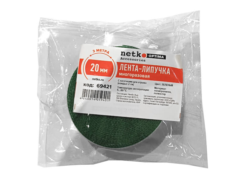Лента-липучка многоразовая 20мм*3м, с насечками для отрыва (каждые 2 см), зеленая NETKO Optima