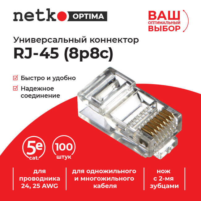 65308 Коннектор RJ45 (8p8c) cat.5e, быстрозажимной ручной, для одножильного и многожильного UTP кабеля, NETKO Optima |